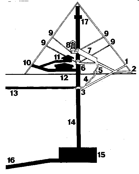 1. Den oprindelige indgang. 2. Nuværende indgang ‑ Al Mahmoun. 3. Det Store Galleri. 4. Dronningekammeret. 5. Kongekammeret. 6. Elevatorskakten. 7. Ukendt kammer. 8. Ukendt kammer. 9. Hemmelig indgang til Atlantis kamrene. 10. Ukendt gang til Sfinksen. 11. Gangen til "den indre Jord"