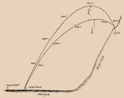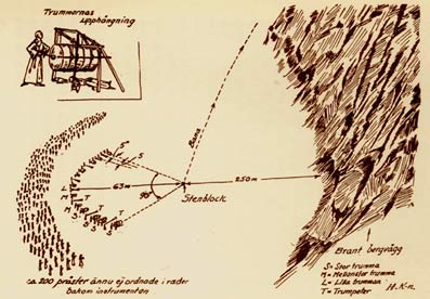 Fig.2 Når arbejdet med at blæse i trompeterne og slå på trommerne begyndte, varede det mindst fire minutter, før der skete noget. Det tog så lang tid, at Jarl blev ængstelig for, at hans film ikke ville række til at filme hele forløbet. Men derpå, og alt efter som slagtakten øgedes og intensiveredes, hævede stenblokken sig langsomt og begyndte at vugge fra side til side, hvorpå den steg op, idet dens hastighed accelererede. Da blokken imidlertid måtte tilbagelægge 400–500 m, før den nåede sit bestemmelsessted, varede hævningen op til nedslagsstedet godt halvdelen af den tid, der brugtes til at få stenen til at komme i bevægelse. Den første filmoptagelse blev foretaget fra et sted bag ved midtertrommen. Jarl bemærkede da, at banen blot tog sig ud som en lige bevægelse opad, hvorfor han optog en film til, denne gang lige fra siden, det vil sige vinkelret på stenblokkens bane. Jarl fik derved et billede, som viste en tydelig parabelform hos kaste- eller løftebanen. Løftningen foregik i nordøstlig retning. Der var fuldstændigt vindstille, og luften var kølig og noget tør.
