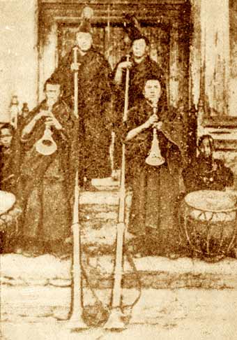 Trommernes bund så ud til at være af metal, og der blev slået på dem med store, tunge køller, hvis hoveder var beklædt med skind. Skafterne var ca. 0,75 m lange. Slagene blev ved hver tromme udført af to præster, der slog skiftevis. Takten var først to slag i minuttet, men øgedes hurtigt så meget, at Jarl ikke kunne følge med. Den mindste tromme gav en skinger lyd, som skar ubehageligt i ørene. Det var tydeligvis en signaltromme, der angav takten, for dens lyd skar gennem al larmen, da både trommer og trompeter var i gang. Trompeterne var 3,12 m lange. Deres tragtåbning havde en diameter på ca. 30 cm. Trompeterne bestod af fem sektioner, der kunne skydes sammen som et teleskop. Sektionerne var længere, jo smallere deres diameter var. For Jarl så det ud til, at deres dimensioner var sådan, at hver sektion fik samme volumen. Også trompeterne, de såkaldte »ragdonger« (se fig. 2), kunne indstilles på en måde, så de fulgte klippeblokken i dens bane, hvorunder de hvilede på særlige stativer. Bag ved instrumenterne var der et par hundrede præster opstillet, således at der bag hvert instrument stod en række på otte muligvis tolv personer, næsten ligesom egerne i et hjul, hvis aksel fandtes i stenblokken. Dog var der en bemærkelsesværdig undtagelse, idet der skråt bag ved den lille midtertromme kun fandtes en højere præst foruden Jarl selv, mens han optog den første film. Præsterne, der næsten overdøvedes af den frygtelige larm fra instrumenterne, sang eller råbte en monoton remse, måske en bøn eller besværgelse. Om disse ekstra præster var til stede for at give hele foretagendet et religiøst præg, eller om de hjalp til med en slags parapsykisk kraftkoncentration, eller om de var med for at lære eller afløse de præster, som efterhånden blev trætte, vidste Jarl ikke noget om.