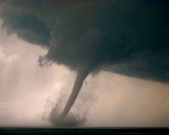 Sådan skaber naturen en hvirvelstorm En luftmasse, der forneden har en del, der er opvarmet af Solen, antages at blive overlejret af en tør, koldere luftmasse, og den oprindelige stabilitet forstyrres. Den opvarmede luft strømmer da opefter, og den opstrømmende luft erstattes med luft, der strømmer ind fra alle sider. Der opstår da på grund af Jordens rotation en rotation i den tilstrømmende luft. Hvis vi antager, at gennembrydningsstedet for den opstrømmende luft befinder sig på 15° nordlig bredde over Atlanten, kan vi antage, at en luftmasse fra 7° nordlig bredde i syd til 23° i nord begynder at bevæge sig mod midtpunktet. Jordens vest-østlige rotationshastighed på 7° bredde er 460 m i sekundet og på 23° bredde 426. Luften på sydsiden vil da bevæge sig 34 m/sek. hurtigere mod øst end det er tilfældet på nordsiden af midtpunktet på 15° bredde, hvilket giver en periferihastighed hos luftmassen på 17 m/sek. Da denne strækker sig fra 7° til 23° nordlig bredde, har den en diameter på 1.750 km eller en radius på 850 km. Ved fortsat rotation vil denne luftmasse blive trukket sammen. Sker sammentrækningen eksempelvis fra 850 til 42,5 km, det vil sige ved at diameteren formindskes 20 gange, så øges periferihastigheden tilsvarende, altså fra 17 m/sek. til 340. At luft med denne enorme hastighed får en ødelæggende virkning, er indlysende.