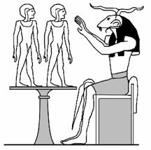 Præsterne understregede, at Ptah er “gudernes hjerte og tunge”. I det gamle Egypten var ordet “hjerte” identisk med “bevidsthed”. Ptah var “gudernes tunge”. Det var altså ham, der udtalte Atum’s skabende ord. Hvis universet er alt det, der er, og alt det der er, er udgået fra Ptahs bevidsthed, rummer Ptahs bevidsthed alt, hvad der kan erkendes. Derfor var Ptah desuden “den absolutte sandhed” om universet og Gud. (I en anden fremstilling lader man visdommens gud Tehuti eller Djehuti fremsige det skabende ord, netop fordi han repræsenterer al visdom). Processen begynder nu at tage form. Atum er viljen og kraften bag universet. Ptah udtrykker Atums vilje som en tankeform, og ordet manifesterer den guddommelige tanke og hensigt. Vi har nu både en bygherre og en arkitekt, men hvem opfører bygningen? Det gør vædderguden Khnum. Han er “håndværksmesteren”, der udfører “bygherrens” plan ved at omsætte “arkitektens” tanketegning til det bygningsværk, vi kender som universet. Khnum kaldes da også “den, der giver ånden form og liv.”